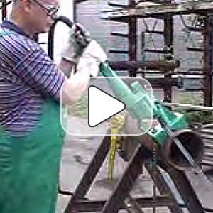 Montaje y uso de la segueta neumática, la guía de arco y el sistema de abrazadera de alimentación automática para cortar tubos grandes.
